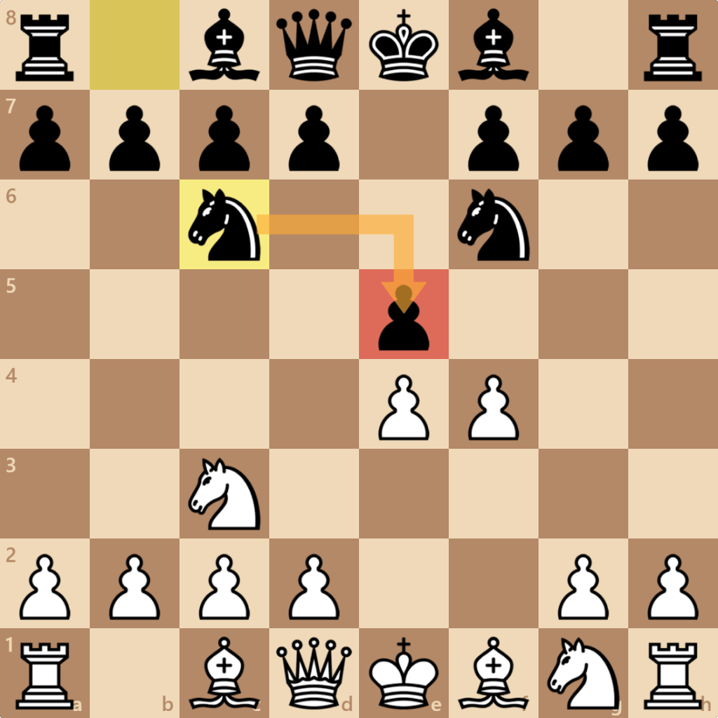 The tactical idea is that we’ve deflected Black’s central pawn to the side, so we can now push our e-pawn further forward (4. e5) and Black is immediately faced with a problem. The pawn now attacks Black’s knight on f6. All their knight’s potential escape squares on the main part of the board are covered by our pieces, and it appears that the only option for Black is to undevelop the knight to g8!