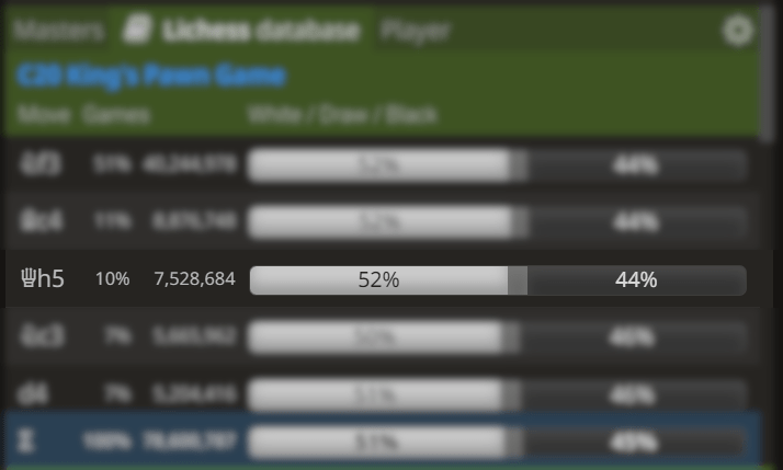 […] Likely itβs been played tens if not hundreds of millions of times on online platforms! When we last looked at the Wayward Queen Attack, I reported that it was played in 10% of (1. e4 e5) games by lower-rated […]