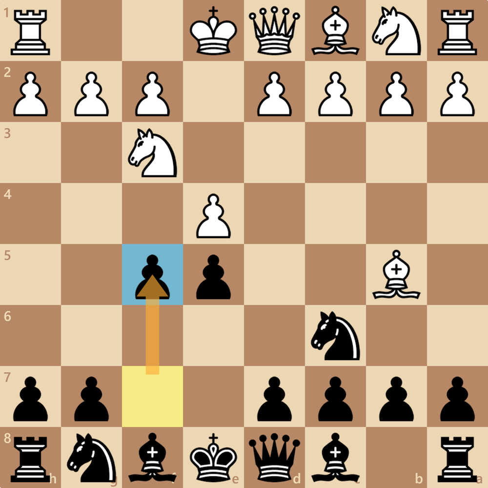 The next time I logged into chess.com a few days later, I once again played the Jaenisch Gambit and this time, White accepted (4. exf5?!). Some of you might have read or watched on chess social media that the Jaenisch Gambit is kind of like a (Falkbeer) Vienna Gambit with reversed colours, and indeed, some of the tactical ideas carry over. Just like with the Vienna Gambit, it’s a relative mistake to accept the gambit!