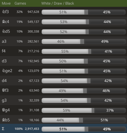 The Lichess community database gives statistics on the top 12 most frequently made moves from the position, which had been reached in almost 3 million games. As can be seen, almost all of them give a win ratio advantage to White, but there is one that appears to be categorically better. The 11th most played move, occurring only 1.1% of the time against the Zhuravlev, is one of my favourite moves in chess: 3. Qg4! Although it isnβt the most accurate according to the engine, itβs certainly not a mistake, and White wins 59% to Black 37%!