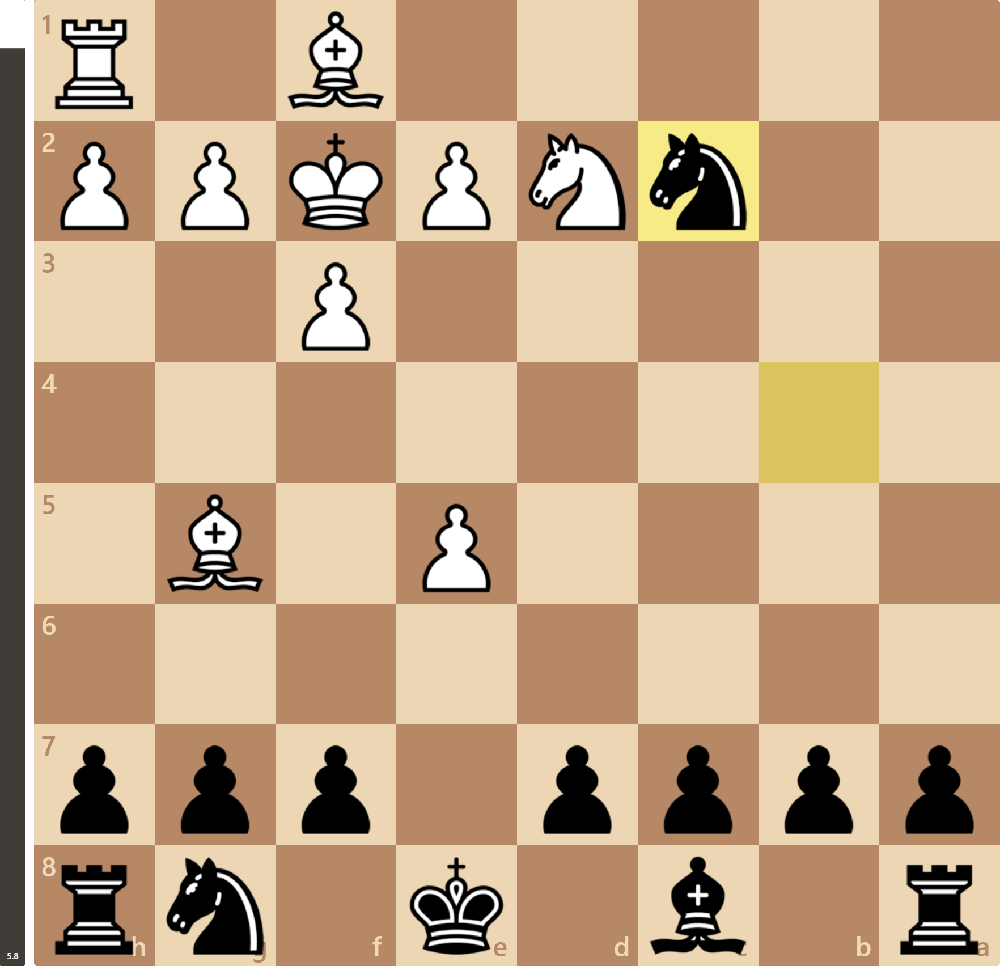 In this game, there was a critical move for White on turn 9. After the very tricky (8… Nd4!?), I was threatening (9… Nxc2+). With White’s king smothered, they’d be forced to trade their queen for the knight to escape check (10. Qxc2 Qxc2)! My neighbour saw this, and recognised the imperative of giving their c2-pawn a second defender. The only correct move was (9. Rc1), but they played (9. Ra2??) . By the end of turn 14, White’s queenside forces had been destroyed. Of the four pieces and four pawns on the queenside, White had only their queen’s (dark square) bishop and d-pawn remaining. These two pieces had managed to avoid the carnage by having the good fortune of being on the king’s side of the board during the opening attack! Englund Gambit, FTW!
