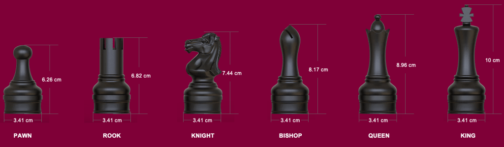 Each chess piece sits atop identical microrobot bases (see below), and this was factored into the piece design so that the pieces are largely consistent with tournament size pieces that pair well with the board. Different to a standard chess set, the diameter of the pieces is all the same, this being the diameter of the microrobot.