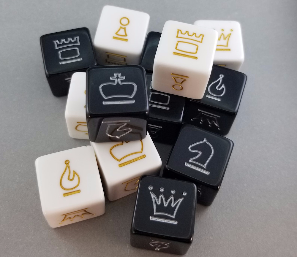 Essentially, each turn we throw three special six-sided dice. Each die has the symbols of the six chess pieces (pawn, knight, bishop, rook, queen, and king) on the faces and we move the pieces rolled by the dice!